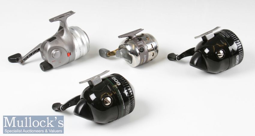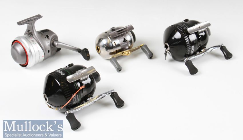 2x Zebco 808 spincast reels heavy duty drive train both appear unused together with a Shakespeare Ambidex Titanium 2002TI spinning reel and a Quick CTE 135 closed face spinning reel in very good condition overall (4)