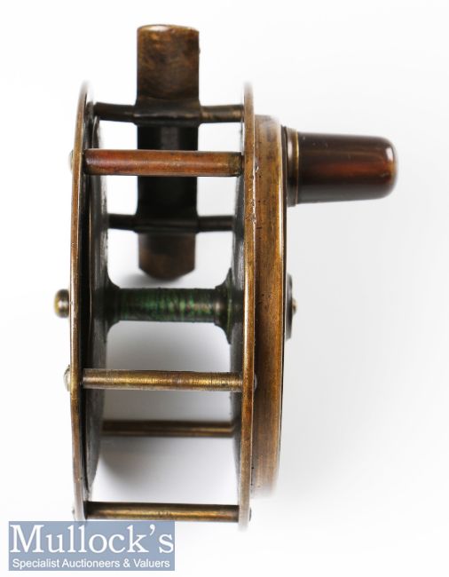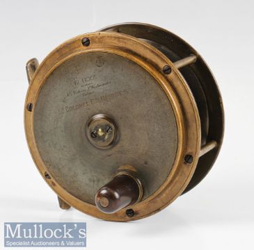 Army & Navy 4 ½” Hercules Style Salmon Fly Reel brass construction with fat horn handle, handle plate stamped with retailers details and neatly engraved with previous owners name ‘Lt Colonel F S Herries’