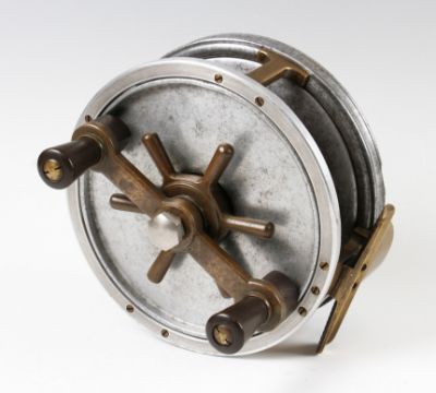 Hardy Bros Alnwick 7” Fortuna Big Game Sea reel with Capstan adjustable brake wheel, twin black handles on brass crossbar, ribbed brass foot in gun metal finish, brass pillars, maker’s marks to rear plate, some heavy wear / corrosion to rim in places, replacement front frame and foot bracket, runs smooth otherwise