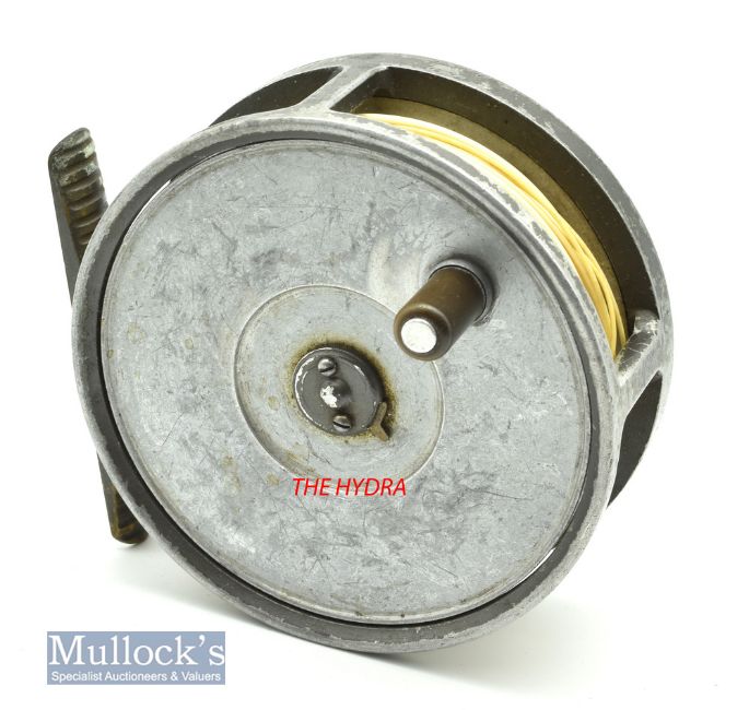 Hardy Bros Alnwick Hydra 4 3/8” salmon fly reel with lacquered ribbed brass foot signs of surface wear, two screw latch, runs smooth otherwise, with line