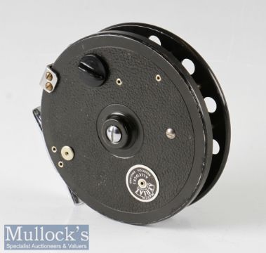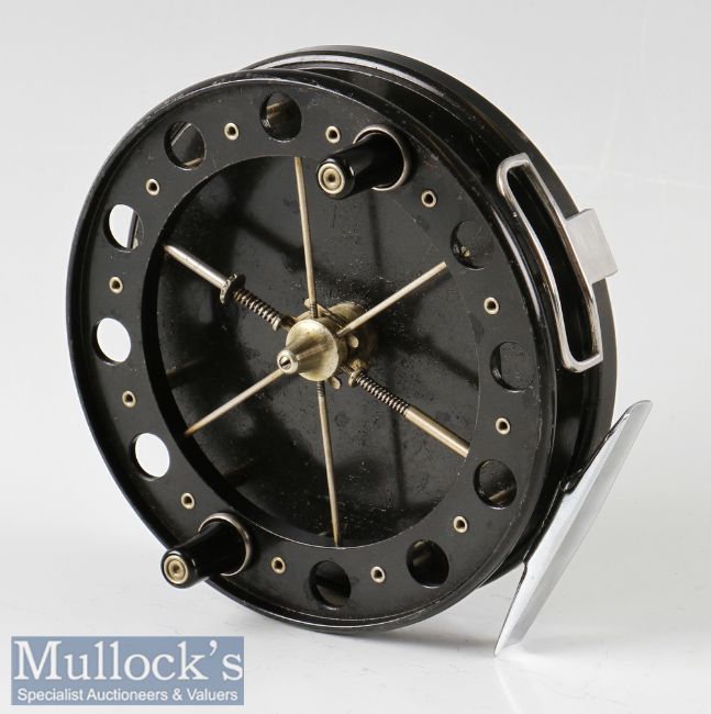 Allcocks Aerial 4 ½” centre pin trotting reel in black finish, with line guide, chrome foot, twin handles, spins very well, in good overall condition