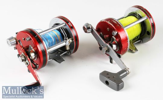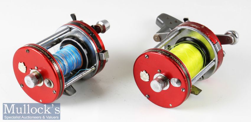 2x Abu Ambassadeur 7000 series multiplier reels in red and chrome construction, marked 760401 and 800601, counter balanced handles, marks apparent, scratches etc, o/w wind smoothly (2)