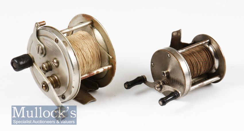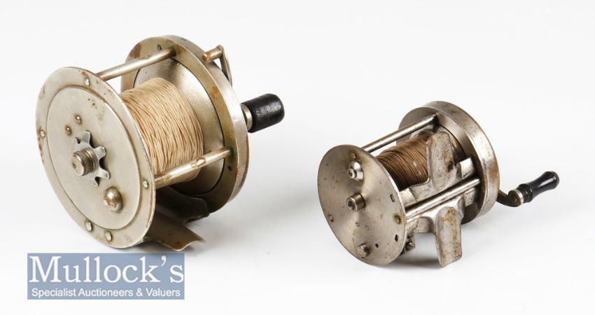 Sears Roebuck & Co nickel silver multiplier reel stamped 250 to foot, end plates measure 3 ¼” approx, 1 ¾” width, with counter balance handle, on/off check, together with a Shakespeare 1905 Deuce Model HG multiplier reel twin handles, level wind, both with signs of use/wear, wind and run smoothly otherwise (2)