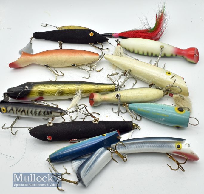 Large fixed lures with the largest measuring 7” such as creek chub pikie, arbogasts scudder, trouble maker, etc in plastic box (10)