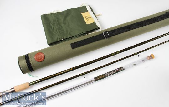 Specialist Quiver Tip Feeder Rod: Hardy Marksman Specialist Feeder Carbon Quiver Tip Rod – 12ft 2pc with 3x quiver tips 2, 3, and 4oz in makers plastic sleeve- fitted with fuji style line guides - very clean cork handle fitted with bronzed anodised combined cork down locking screw fittings - appears unused in cloth bag and makers cordura rod tube (VG)