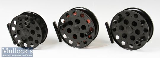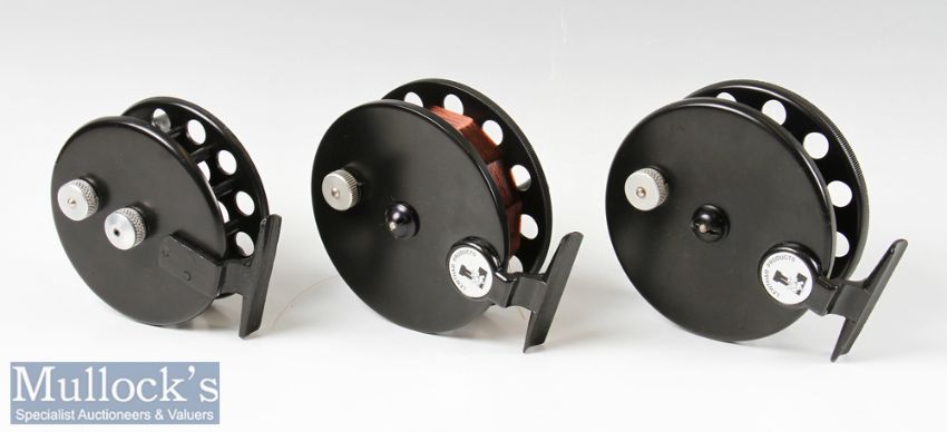 Lewtham Products ‘The Leeds Reel’ centre pin trotting reels to include a 4 ¼” model and 2x 4 ¾” models, all with pull-up knurled knobs, appear unused with boxes (3)