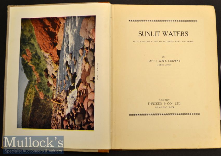 Book on Fishing in India: Capt C W W S Conway - “Sunlit Waters - An Introduction to The Art of Fishing with Light Tackle” 3rd imp. 1943 (1st publ’d in April 1942) publ’d Thacker & Co Ltd Bombay – 4to - 13x full page plates, 3 in colour plus text drawings – some weakness to front inside hinge – one corner badly bruised – some hand written pencil notes to text - otherwise clean internally – seldom found book on fishing in India