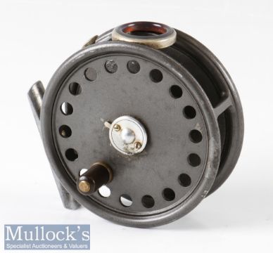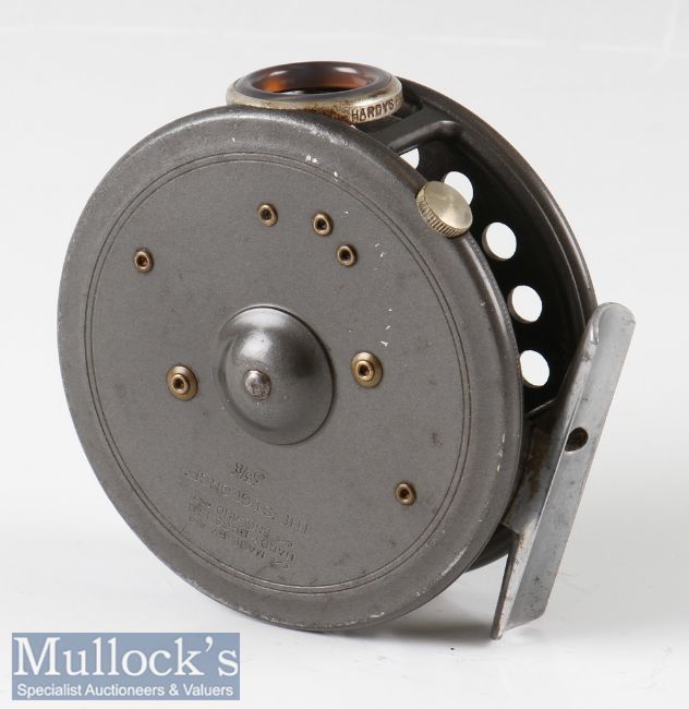 Hardy Bros England 3 3/8” St George alloy fly reel with agate line guide, rim tensioner, alloy foot, two screw quick release latch, surface wear, paint loss in places, otherwise runs smoothly