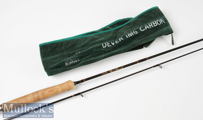 Fly rod: Bob Church Dever Carbon Trout Fly Rod - 8ft 2pc line 4/5/6# -fitted throughout with fuji style line guides – lightly soiled cork handle – alloy up locking screw winch fittings – makers ragged green cloth bag – otherwise lightly used.