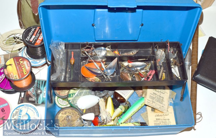 Selection of Fishing Accessories to include a canvas bag with two front pockets, shoulder strap etc, plus a blue plastic cantilever box with spoons and lures, a priest, leader line and various flies (Qty)