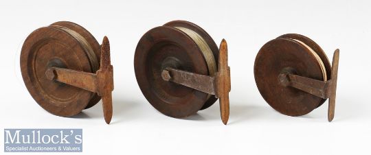 3x Wooden and metal pillar back matching narrow drum reels – 2x 3 3/8” and 1x 7/8” – all need cleaning