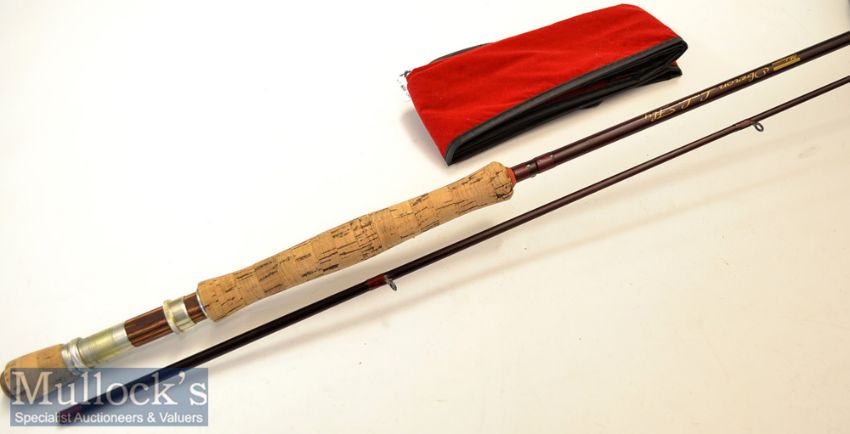Fly rod: Shakespeare Oberon L L Fly carbon rod – 9ft 10in 2pc line 5-7# - fitted with Fuji style lined guides throughout clean 13” shaped cork handle with cork butt extension - fitted with wooden grained reel seat with screw locking winch fittings well looked after rod comes in the original red makers cloth bag (G)