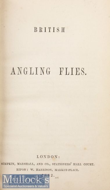 Fishing Book: Theakston, M – “British Angling Flies” 1st ed London 1862, half leather/marbled boards with ribbed gilt spine c/w 9x engraved plates of flies, ex libris private bookplate – front marbled free end plate has been clipped down the leading edge and sellotaped to hinge – overall a good clean copy.