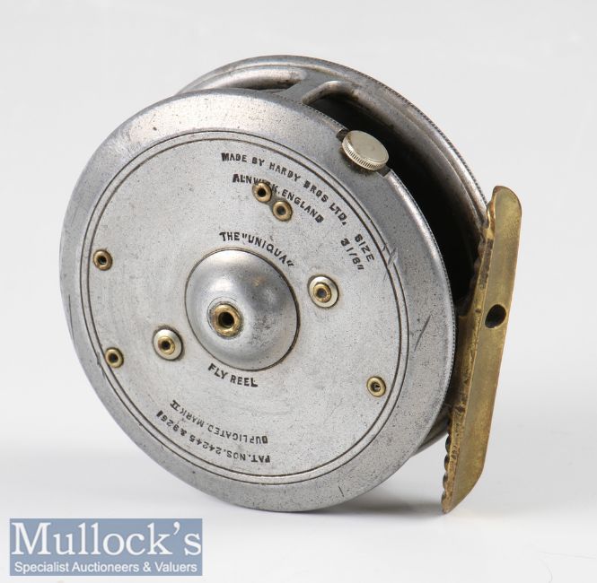Hardy Bros Alnwick 3 1/8” Uniqua Dup Mk II alloy fly reel with brass ribbed foot, horse shoe latch, rim tensioner, wear apparent, runs smooth otherwise