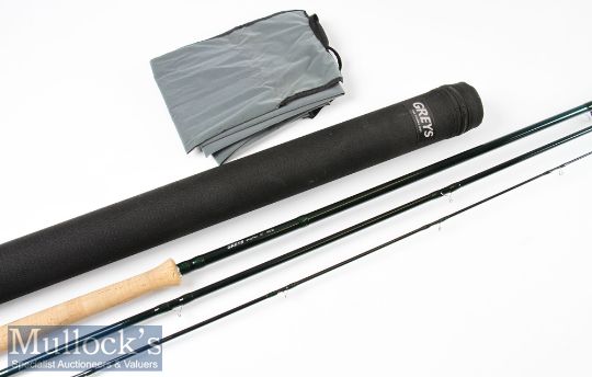 Salmon Fly Rod: Greys Alnwick Greyflex Carbon fly rod – 13ft 3pc line 9/10# - with 2x Fuji style lined guides – very clean unused cork handle with anodised screw locking winch fittings-complete with maker’s matching green cloth bag and the original maker’s black cordura rod tube – appears unused (VG)