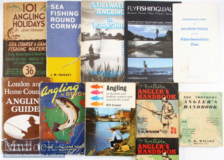 Selection of Various Angling Guides from the 1960s onwards (11): to include John Norman “101 Angling Holidays” 1st ed 1954; Angling in Norfolk and Suffolk Waters And Around The Coast c1967; 3x The Northern Angler’s Handbook c1960s; Angling in Devon 1st ed 1960; London and Home Counties Angling Guide (no map); Fisherman’s Map of Salmon Pools on the Aberdeenshire Dee; Sea Fishing Round Cornwall 1st ed 1970; Stillwater Angling in Yorkshire; and Fly Fishing Wales c2004.