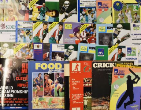 Cricket and Other Sports Book Selection – incl Over the Summers Again by George Greaves, King Cricket by Gary Sobers, My Country’s Keeper, Wisden Cricketers’ Diary 1986 and others, 25 1990s Glamorgan cricket programmes, framed drawing by Bogo titled Sackcloth and the Ashes, together with other books including Tarbuck on Golf, Arnold Palmer; portrait of a professional golfer, baseball, curling, weight training, sports yearbooks and others (Box)