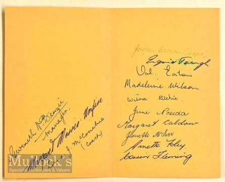 1963 Inaugural Women’s Netball World Championship Tournament signed card by the winners Australia – hosted by England in Eastbourne – single folded made up card which has mistaken printed Basket Ball and Not Net ball “Australian Basket Ball Team - International tournament” signed inside by the entire Australian Team, incl Manager, Coach and Umpire (13) as follows: Gweneth Benzie - Team manager - Awarded IFNA service award in 1983, AANA service award 1965 and order of Australia - inducted into hall of fame in 2009; Coach - Lorna McConchie - inducted in the Australian Netball hall of fame in 2009; Umpire - Miss Margaret Morris - at the 1963 World Netball Championships; Capt Margaret Caldow - Captained Australia for 8 yrs, National Assistant coach - Australia, Coached England at the 2007 World Championships, a member of the sport Australia hall of fame, awarded the British Empire Medal, inducted into the hall of fame in 2008; Annette Foley - player, two time world champion, regarded as one of the finest defensive players ever produced in Western Australia, inducted into the Australian Netball hall of fame in 2012; Joyce Brown (rubber stamp signature) - Player and captain - 1992 medal of the order of Australia (OAM) for services to sports, inducted into the Australian hall of fame in 2008; Ingrid Tough – player; Val Eaton; Madeleine Wilson;  Wilma Shakespear - (nee Ritchie) player, coached Australia to 3 world championships (Gold 1971 Jamaica, Gold 1979 Trinidad & Tobago, Silver 1987 Glasgow) Netball Australia service award in 1989, inducted into the hall of fame in 2010; June Noseda - player - inducted into Australia Hall of Fame in 2011; Jeanette Mclver – player; Corrin Fleming – player – a wonderful piece of history which has seen the sport develop over the years beyond everyone’s imagination. Note: Since its inception the competition has been dominated primarily by the Australian national netball team (the Diamonds) and the New Zealand national netball team (the Silver Ferns), as of the 2019 event having both medalled in every one of the 15 championships – Trinidad and Tobago is the only other team to have won a title (a three-way tie in the 1979 championship. The most recent tournament was the 2019 Netball World Cup in Liverpool, England, which was won by New Zealand.