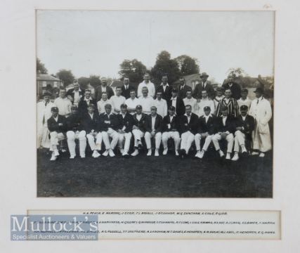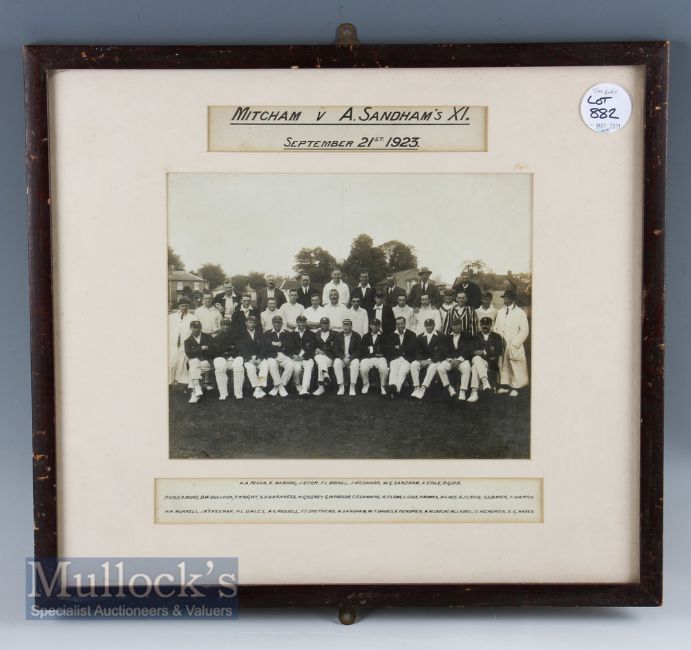 1923 Mitcham v A Sandhams XI Cricket Team Photograph played September 21st 1923 with a full list of participants with some notable England and County players in the match including Andy Sandham, Ernie Hayes, A C Russell, H R Murrell, J R Freeman, W J Abel and others, mf&g, 48cm x 43cm