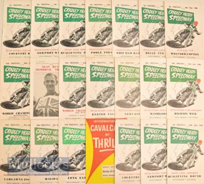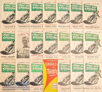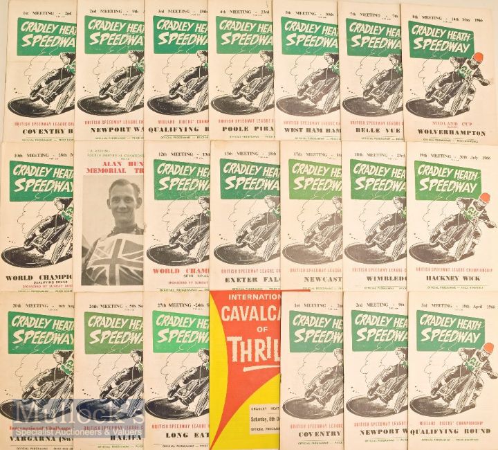 1966 Cradley Heath Speedway Programme Selection includes League Championship, Midland Rider’s Championship, Midland Cup 2nd leg, World Championship Qualifying round, Allan Hunt 4th, World Championship Semi Final, International Challenge Match v Vargarna Sweden, International Cavalcade of Thrills, some duplication, condition mixed A/G overall (45)