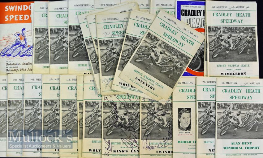 Selection of 1968 Cradley Heath Speedway Programmes –23/27 near complete run of home programmes to incl British Speedway League, Challenge Match, Alan Hunt Memorial Trophy, World Championship qualifying round Midland Riders Championship qualifying round Midland Cup RND, v Prague, Dudley-Wolves Trophy, and 2x v Swindon (A) et al - some have signatures to the front and back covers - 11x duplicates - all with hand written results otherwise generally overall (G) (36)