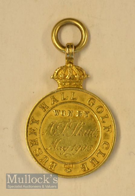 1905 Bushey Hall Golf Club yellow metal winners medal - with the clubs motto and crest c/w crossed golf clubs embossed on the obverse and engraved on the reverse won by A J Shaw May 1905 overall 1.5’x 0.75’ (38mmx x21mm) – wt 9g. Note: Part One – Golf Collection from “David Easby Estate”