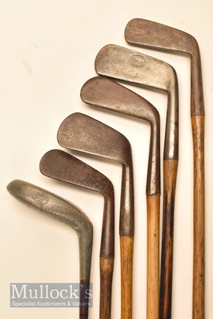 6x various irons and putters – incl D & W Auchterlonie St Andrews and North Berwick deep faced straight blade putter c/w shaft stamp featuring the St Andrews bowed shaft, an interesting Forgan St Andrews Kent alloy mallet head putter fitted with an early coated steel shaft, A W Robertson Deep Mashie Iron together with 3 others including a boys mashie, Winton mid iron shortened and the putting cleek with bowed shaft.