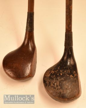 2x Interesting socket neck woods - Fraser heavily weighted practice club and an original Forgan “Junior” dark stained persimmon brassie - both with original full length leather grips