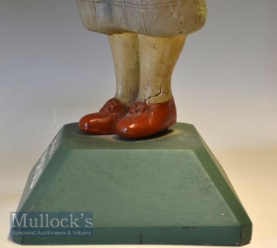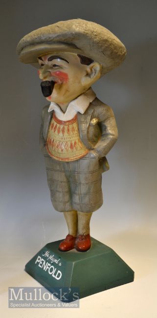 Penfold Man advertising golfing figure c1935 – c/w pipe and mounted on the original square splayed base inscribed “He Played a Penfold” – some cracks to the left ankle, and visible crack around the neck – - all easily remedied 20.5” x 6.5” x 6.5”# Note: Part One – Golf Collection from “David Easby Estate”