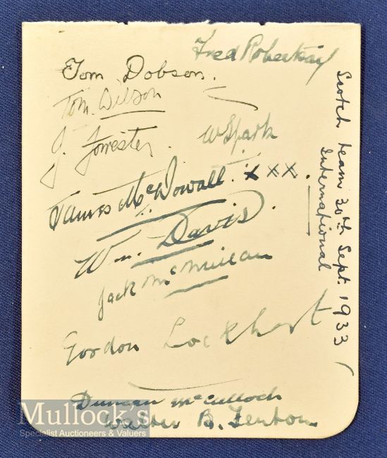 1933 Scotland Golf Team Autograph Page featuring autographs of Dobson, Wilson, Forrester, McDowall, Davis, McMillan, Lockhart, McCulloch, Fenton, Spark and Robertson dated 30th Sept v Ireland at Dalmahoy Edinburgh with Ireland winning the match
