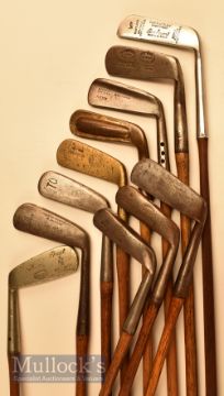 11x Various and interesting cross section of assorted blade putters including Cochrane’s Warrior mark left hand bent neck putter, Anderson Anstruther brass straight blade, Nicholson Pittenween goose neck, Scott Elie POWF Gem, Cochrane Gem, early Ben Sayers Benny Gruvsol putter with square hosel shaft and grip – all with grips