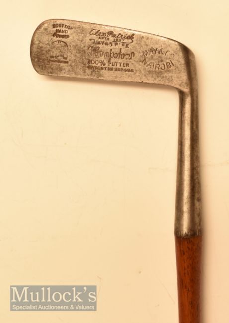 A Compston 100% patent putter with Scottish hand mark of Alex Patrick stamped May & Co Nairobi, with the square sectioned grip end shaft bowed to be in line with the middle of the blade