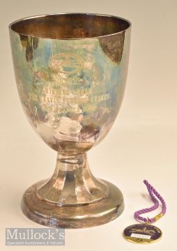 Horse Racing – York ‘The Travis Perkins Stakes October 2001’ Trophy engraved to the front, marked Links London to base, no hallmark, measures 20cm H, dia 12cm, plus York County stand medal. Winning horse was Welsh Wind owned by Michael Wigham ridden by Simon Whitworth (2)