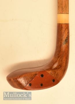 An attractive small wooden head driver shaped golf walking stick with rounded sole, brown fibre triangular insert with retaining plugs, rear lead weight, pinned hosel with plastic collar, measures 29” overall