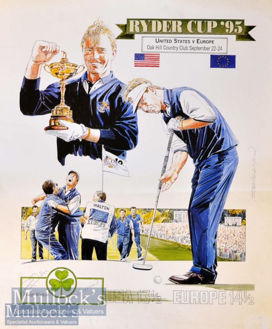 1995 Ryder Cup Oak Hill Country Club USA signed ltd ed colour print by the famous sporting artist and illustrator Paul Trevillion and European team member Philip Walton in pencil to the border – ltd ed no 26/850 – some stains to the edge of the borders - loose – overall 21.5” x 17.5” – Note: The unheralded Irish rookie Philip Walton who went out second to last and the last singles out on the course- secured victory for Europe by defeating Jay Haas by one hole and winning for the second time on American soil.