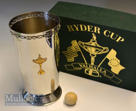 2008 Ryder Cup Boardman USA Pewter Wine Cooler – Renowned American Makers Est 1760s decorated with Ryder Cup Trophy and engraved on the opposite side “Presented by The PGA of America – on the occasion of The 37th Ryder Cup – Valhalla Golf Club September 2008” won by the US – overall 10.25” x 5” and comes in original decorative presentation box with cloth protective sleeve. Note – The above is a special one off Ryder Cup Golf Item given by either The US PGA or The PGA to Players and Officials Only – quite unique item