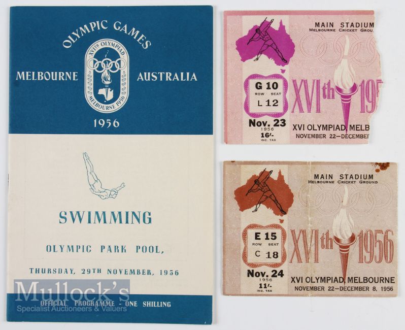 1956 Melbourne Olympics Programme and Tickets (3) programme for Swimming 29th November, very good condition, tickets for Athletics 23rd and 24th November, both fair one having tear to right edge (3)