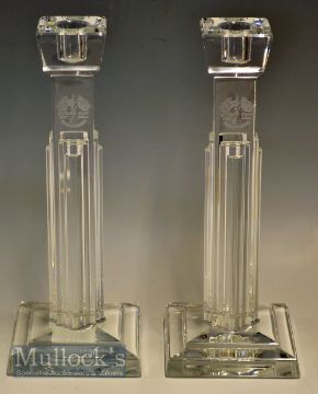 2004 Ryder Cup Fine Pair of Waterford Crystal Metropolitan Cut Glass Candlesticks both etched with the Ryder Cup detail, date and venue – played at Oakland Hills Country Club – won by Europe under Bernhard Langer’s guidance – overall 10” x 4” x 4” c/w 2004 Ryder Cup Headed Note Paper - very impressive and still in makers original box. Note – The above is a special one off Ryder Cup Golf Item given by either The US PGA or The PGA to Players and Officials Only – quite unique item