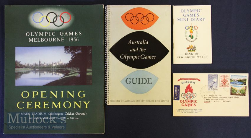 1956 Melbourne Olympics Ephemera Selection (4) opening ceremony souvenir programme with coloured covers, 28cm x 22cm, mini-diary 80 page booklet detailing events, Australia and the Olympic Games guide illustrated publication and a first day cover addressed to London, all good condition (4)