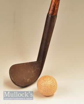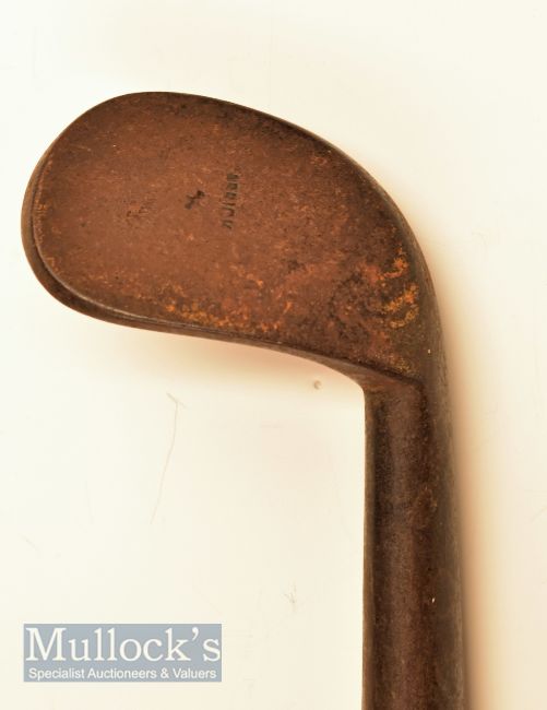 c1850 Carrick track iron with oval hosel near head, an indicator of an early blacksmith made iron, 5 ¼” stout hosel with wide neck crease, wide sole, concave face 2 ½” x 1 7/8” – 36 ¾” overall length, fitted with an original fine grip, appears with little signs of use
