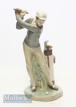 Lladro Bone China Golfer Figure standing about to swing next to bag of clubs, detachable golf club is missing, otherwise good, height 29cm