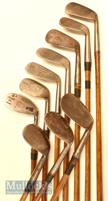 10x Assorted irons to including Decca mashie niblick, Gibson of Kinghorn mashie niblick, wide sole small head niblick with multi punch dot face markings, large head niblick stamped dreadnought by Gibson, Diamond mashie, Gordon Lockhart of Gleneagles stainless mashie niblick and a Tom Walton mashie niblick showing the rampant Lion cleek mark et al – all with grips