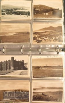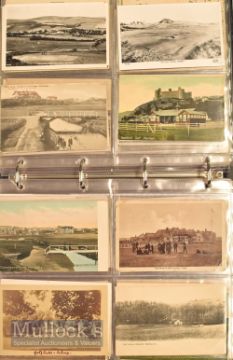 Large quantity of early Golf Postcards including a wide variety of topographical postcards featuring The Royal and Ancient, Troon, Carnoustie, Turnberry, Hoylake, Ranfurly Castle, Lossiemouth, North Berwick, Elie, Aberdovey, Gleneagles, Harlech, Stirling Castle, Leven, et al, mixed condition, generally appear G overall condition, within folder and plastic sleeves (#300)