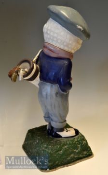 Dunlop Caddy advertising golfing figure-mounted on naturalistic splayed base inscribed to 2 panels “We play Dunlop” together with 3x clubs as found, replaced shoulder strap and inscribed Dunlop No.6 to the rear of the head - still on the original ply board base - overall 16”# Note: Part One – Golf Collection from “David Easby Estate”
