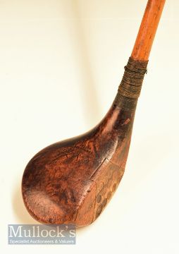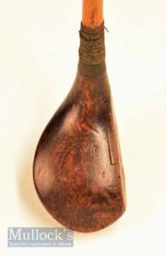 H L Curtis Bournemouth patent brassie with central horn insert retained by 12 wooden plugs with full brass sole plate and fitted perforated leather grip