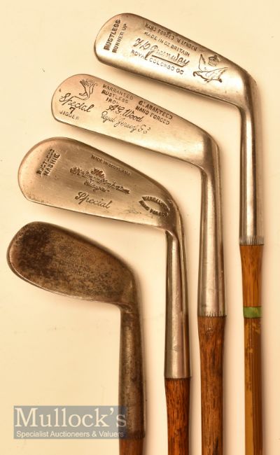 Rare and unusual TD Currie of Dornoch small head Ladies rut iron sized niblick together with Runner Up wide soled iron stamped Greenway Royal Columbo GC, AG Wood of Royal Jersey GC jigger and a mashie – all with grips (4)