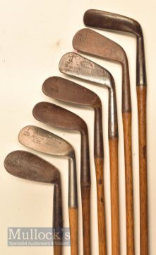 6x Forgan Flag Model Irons and early R Forgan & Son Gem putter (7) – fine R Forgan & Son “100” Gem style putter fitted with replaced Original Kinghorn Tacky leather grip; irons incl No.1, 3, 2x Mashie niblicks and niblick - 2x with shaft stamps – all with variety of grips