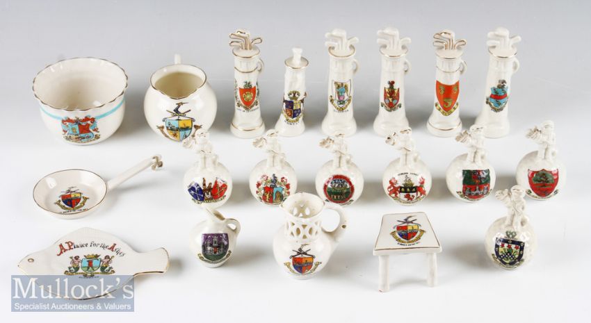 13 Crested Ware Golfing Interest Items including 6 golf bags incl Bude, Tunbridge Wells, Huntley, Leicester, Skegness and Dumfries, with 7 golf ball and golfer examples with crest incl Cannock, Royal Leamington Spa, Swaffham, Bramber, Windsor and others, with 7 other crested ware items incl jug, bowl, stool, 2x miniature jugs, pan and fish dish, all various makers (20)