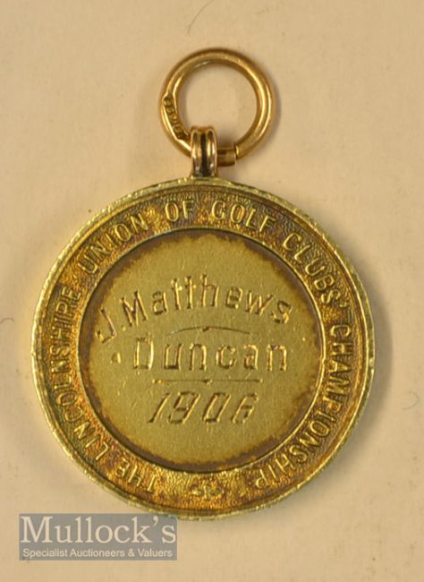 1906 The Lincolnshire Golf Union of Golf Clubs Championship 15ct gold winners medal - engraved J Matthews - “Duncan” 1906 – c/w suspension ring hallmarked 15ct - overall 1” dia (25 mm) wt 15.4g. Note: Part One – Golf Collection from “David Easby Estate”