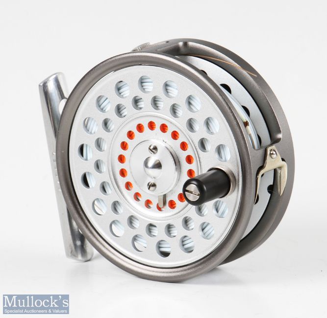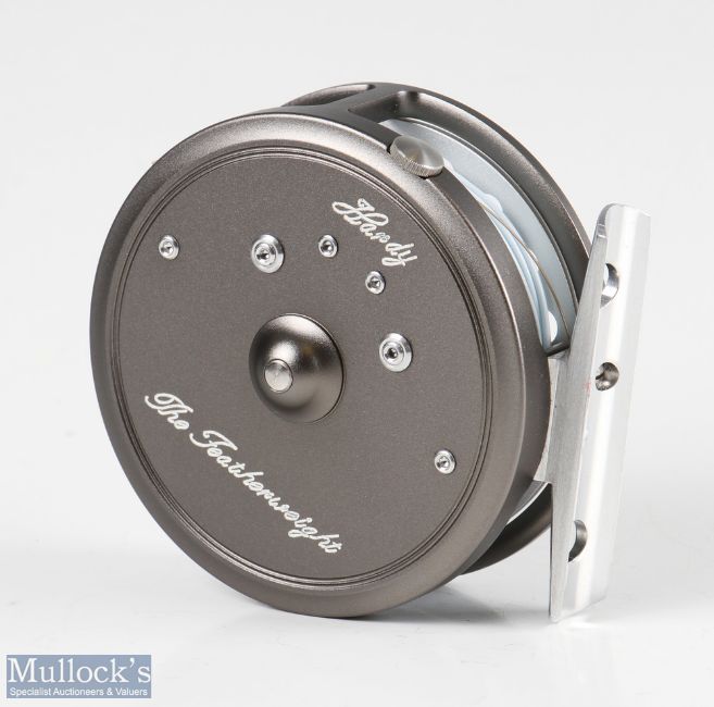 Hardy Bros England Featherweight 2 7/8” alloy fly reel with line guide, smooth alloy foot marked A42957, with line, in almost as new condition with neoprene case